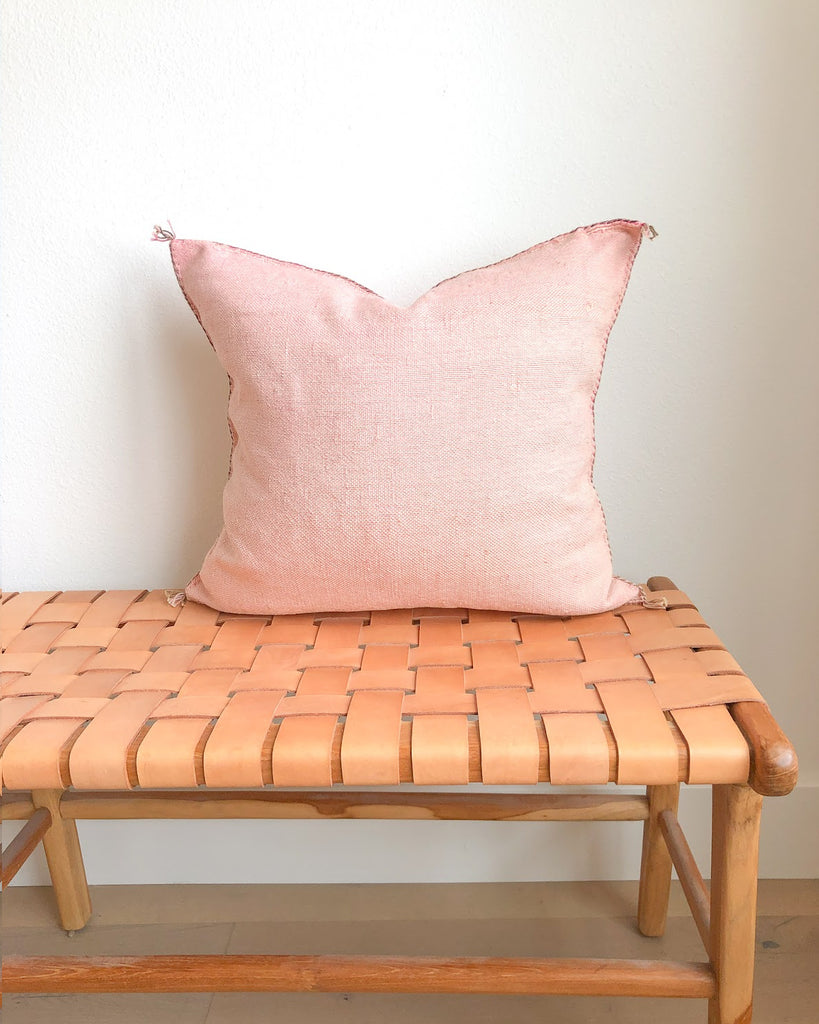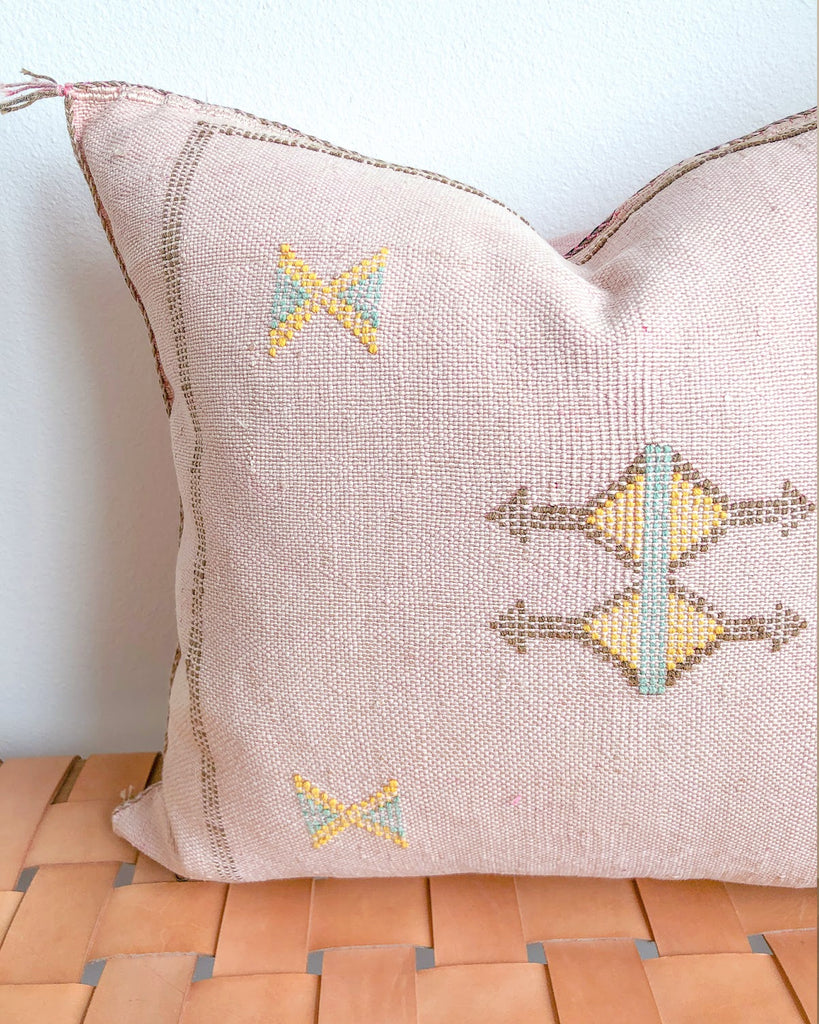 Moroccan Sabra Silk pillow cover.  These pillows are hand woven from fibers that are extracted from the Saharan agave cactus and wool.  Hand stitched with decorative multi color design.  Every pillow is completely unique. Zipper closure along bottom.  Poly fill stuffed.