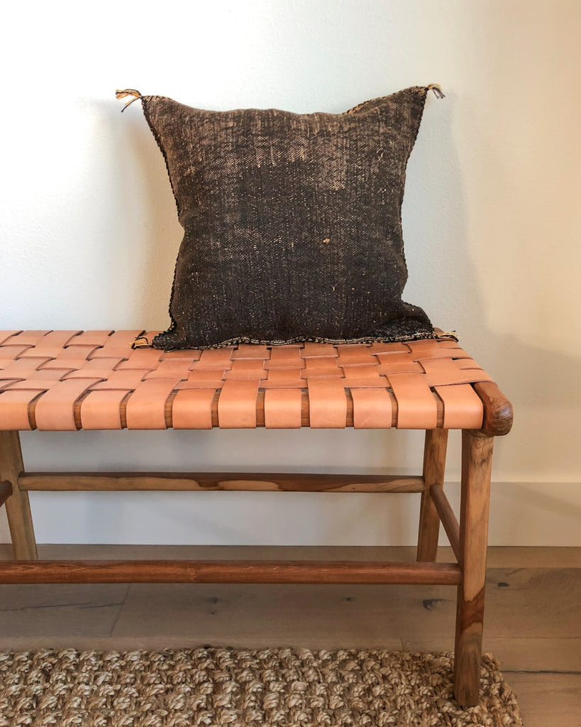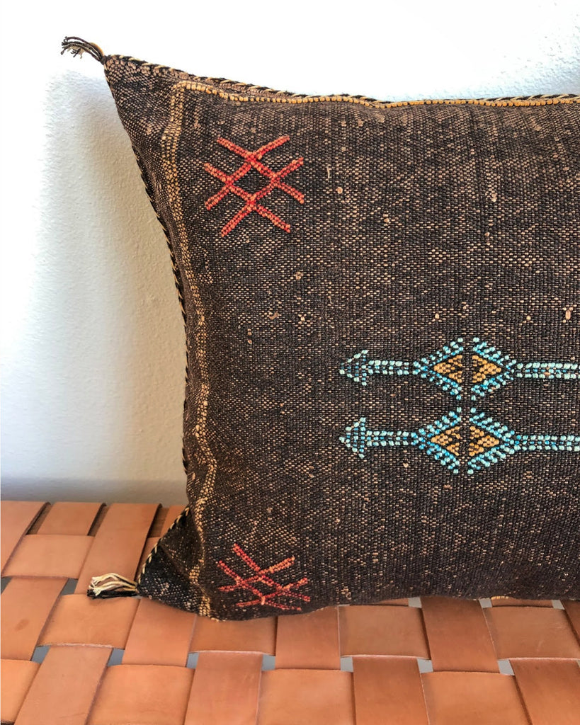Moroccan Sabra Silk pillow cover. These pillows are hand woven from fibers that are extracted from the Saharan agave cactus and wool. Hand stitched with decorative multi color design. Every pillow is completely unique. Zipper closure along bottom. Poly fill stuffed.