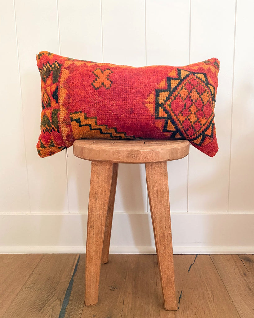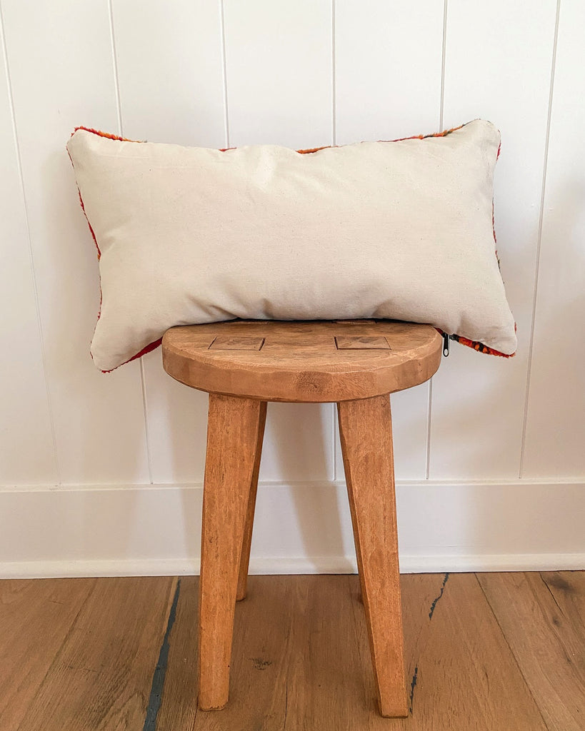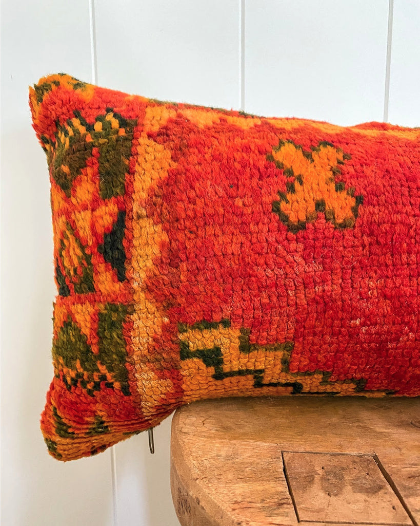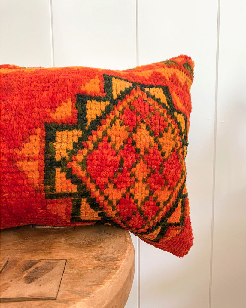 Pillow cover made from vintage Moroccan rug. Medium pile. Backside has woven fabric. Zipper closure along bottom. Poly fill stuffed.