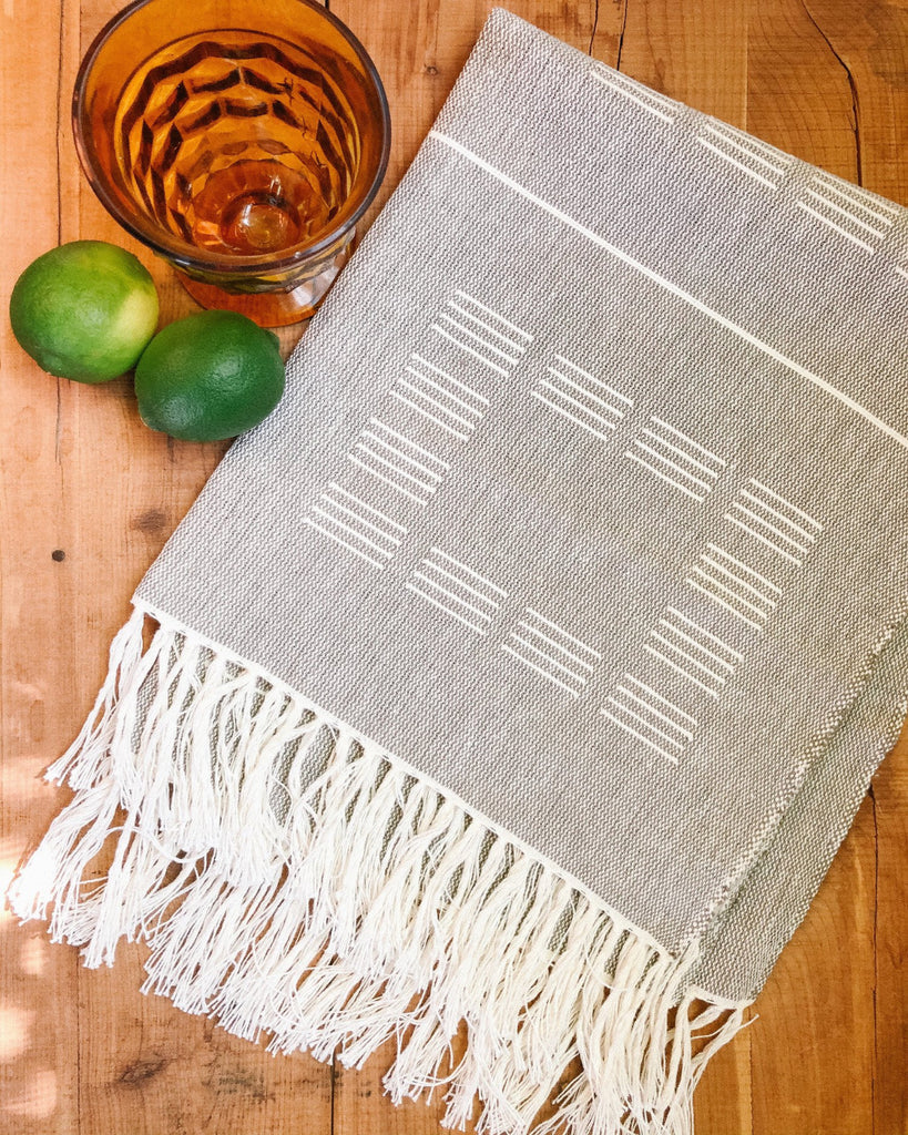 This tea towel is a classic yet modern addition to any kitchen or bathroom.  Soft enough to function as hand towel and sturdy enough to soak up spills in the kitchen.  You can also use them as a centerpiece on a dining or coffee table.  Handwoven by a family run co-op in Oaxaca, Mexico.  Finished with rustic edge and fringe.  Ethically made.