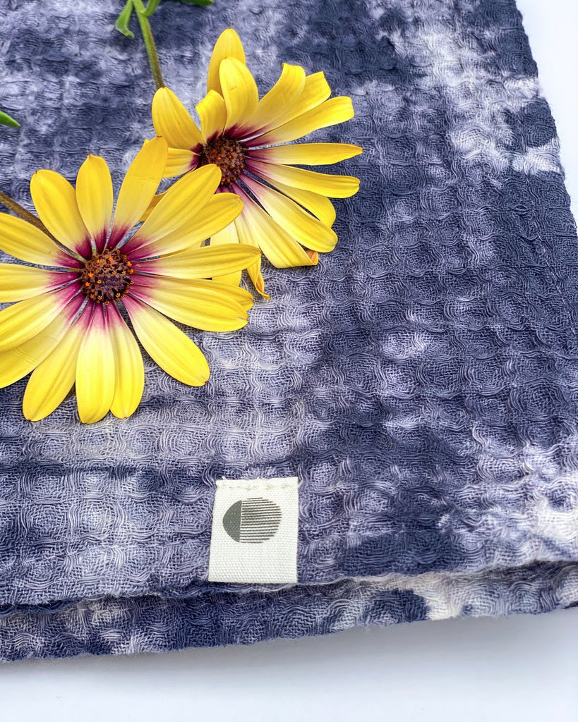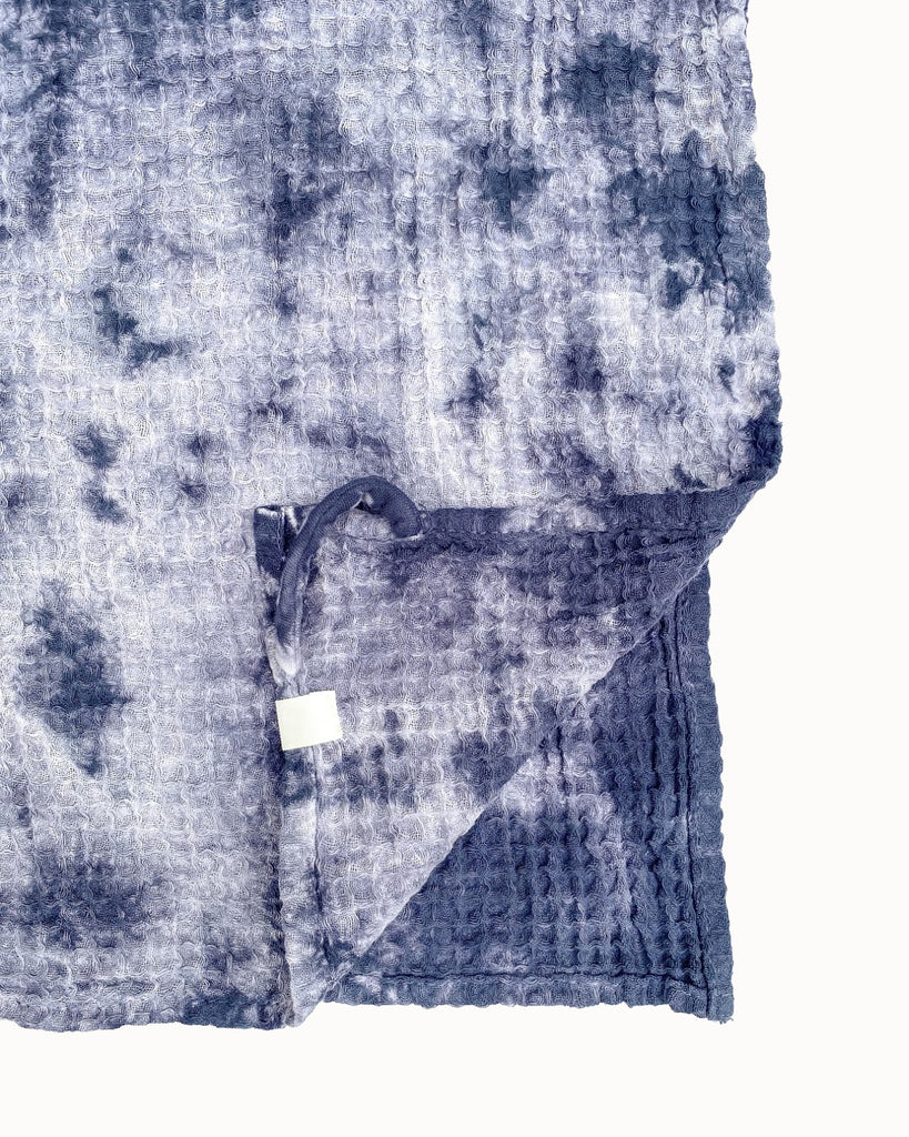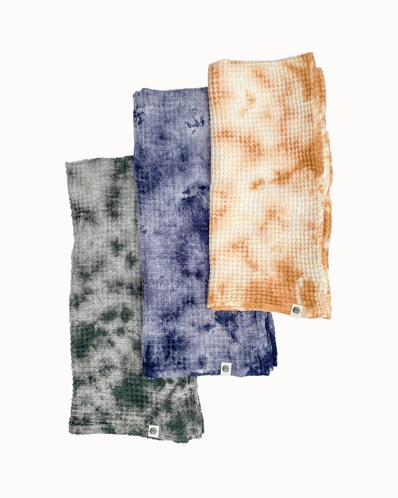 Cotton / Linen blend Waffle knit hand towel distress dye.  Each towel has been hand dyed and is completely unique.  Includes hanger loop at corner for easy storage.