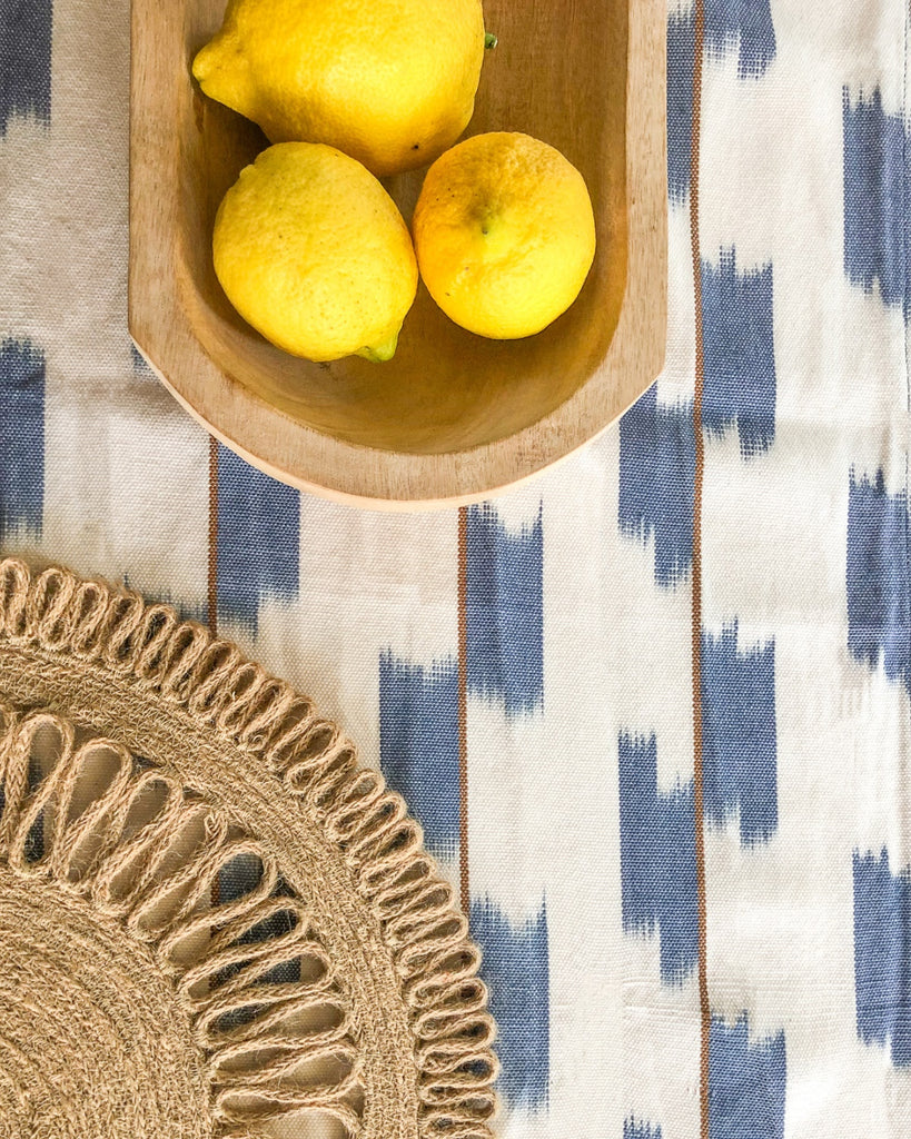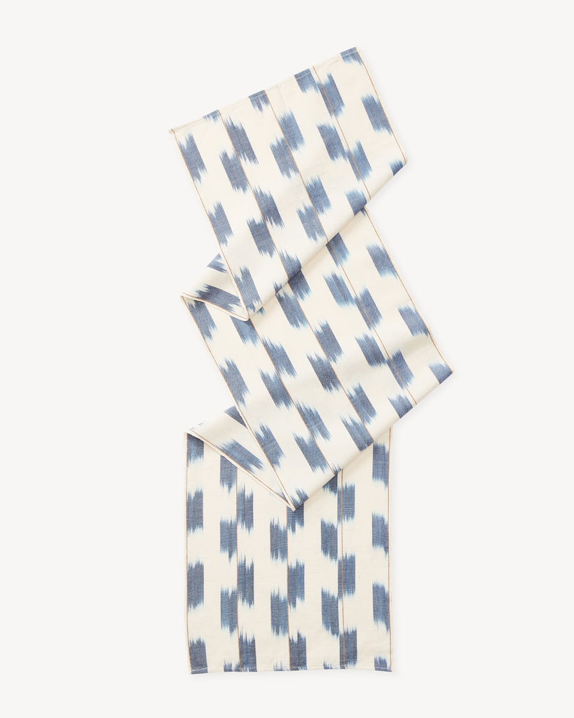 Add a pop of color to any room in your house with our Ikat runner. Style on your dining table, coffee table, dresser or bookshelf. Handwoven by a family run cooperative of weavers in Nahuala, Guatemala. The cotton threads are first knotted and dyed before warping the loom, resulting in a painterly effect after weaving. Ethically made.