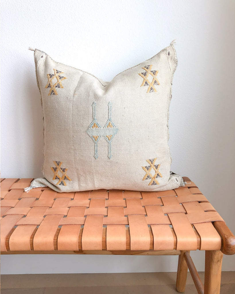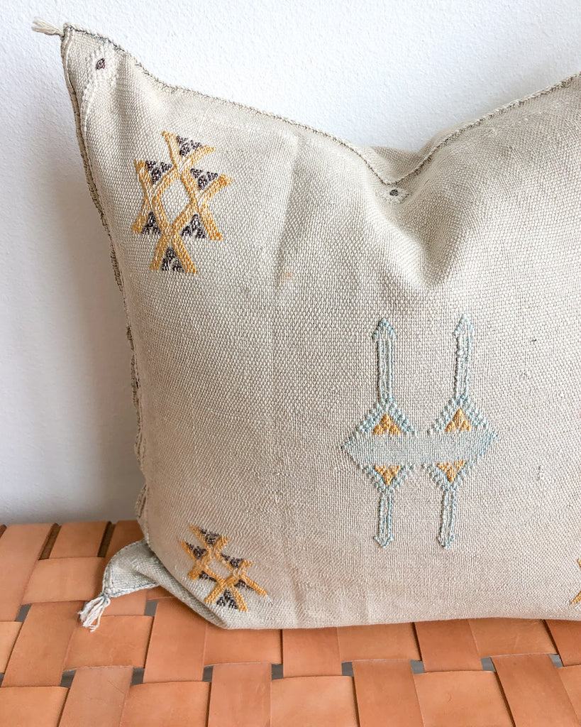 Moroccan Sabra Silk pillow cover. These pillows are hand woven from fibers that are extracted from the Saharan agave cactus and wool. Hand stitched with decorative multi color design. Every pillow is completely unique. Zipper closure along bottom. Poly fill stuffed.