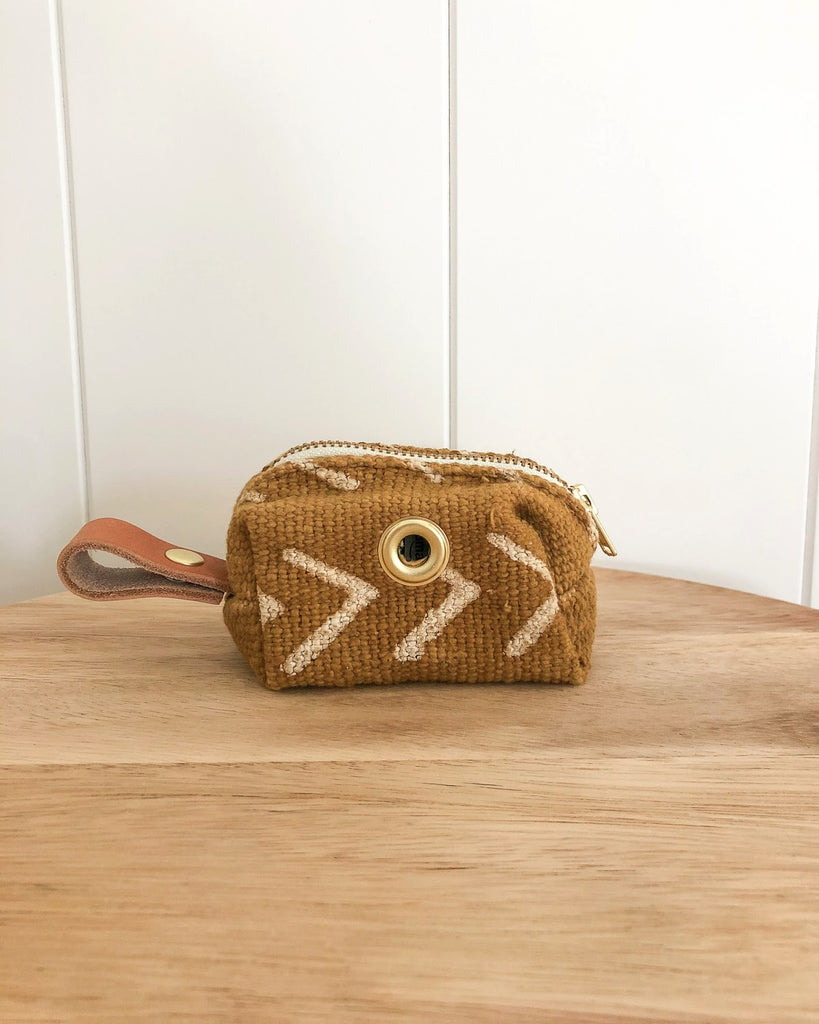 Handmade pet waste bag holder and dispenser made with durable mudcloth fabric. In addition to the waste bags, there is just enough room to pack some money and a car key if you want to lighten the load on your walk.