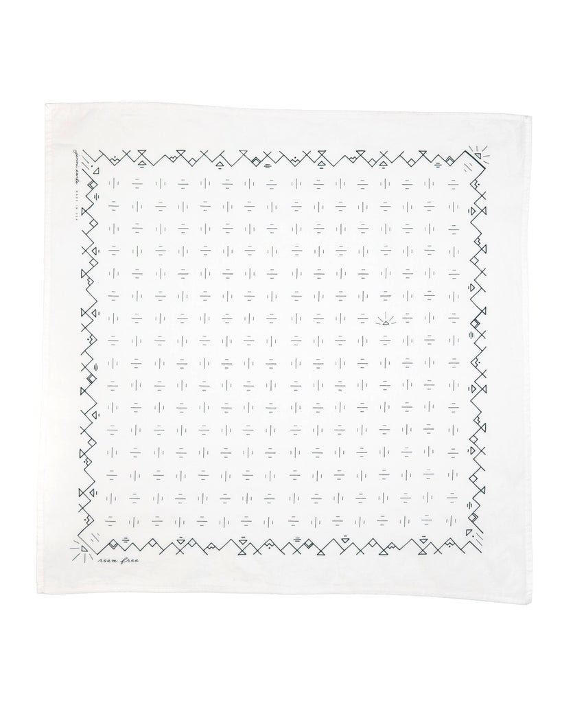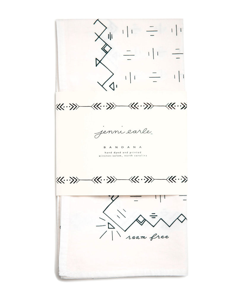 100% southern grown and milled Cotton, hand dyed and printed bandana. Features hand drawn design and the words 'Roam Free' on one corner. Tie around your neck or your hair for a great summer accessory. Handmade in Winston Salem, North Carolina.