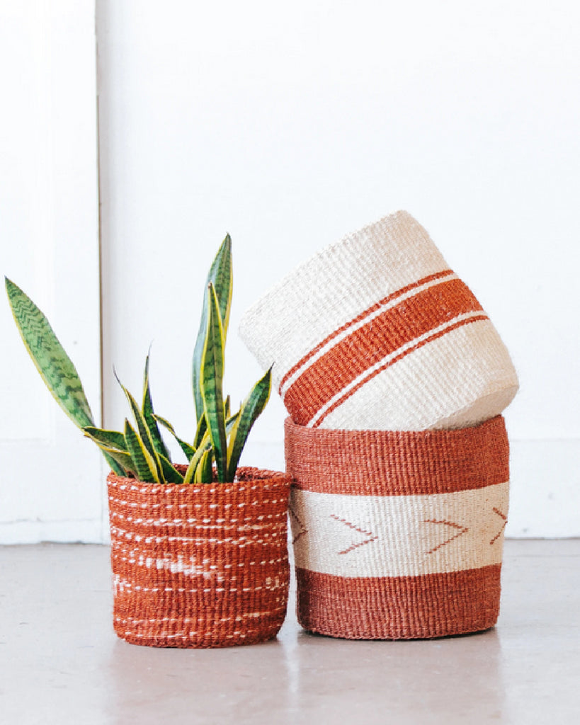 These sisal, woven baskets are handmade by a weaving cooperative in southeastern Kenya. They are naturally dyed using soot, lending to a unique variation in tone with each one. The pattern also varies from piece to piece, as each weaver has their own technique. These African baskets are great as plant holders, catchalls, toy baskets, storage baskets, or to liven up a space.