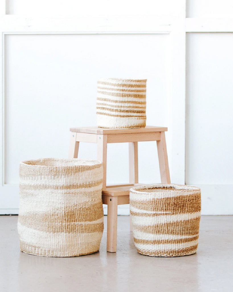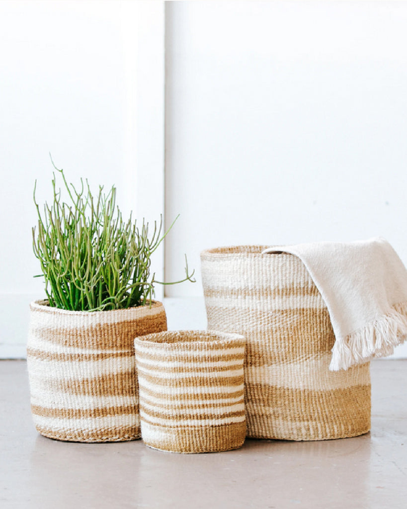 These sisal, woven baskets are handmade by a weaving cooperative in southeastern Kenya. They are naturally dyed using soot, lending to a unique variation in tone with each one. The pattern also varies from piece to piece, as each weaver has their own technique. These African baskets are great as plant holders, catchalls, toy baskets, storage baskets, or to liven up a space.