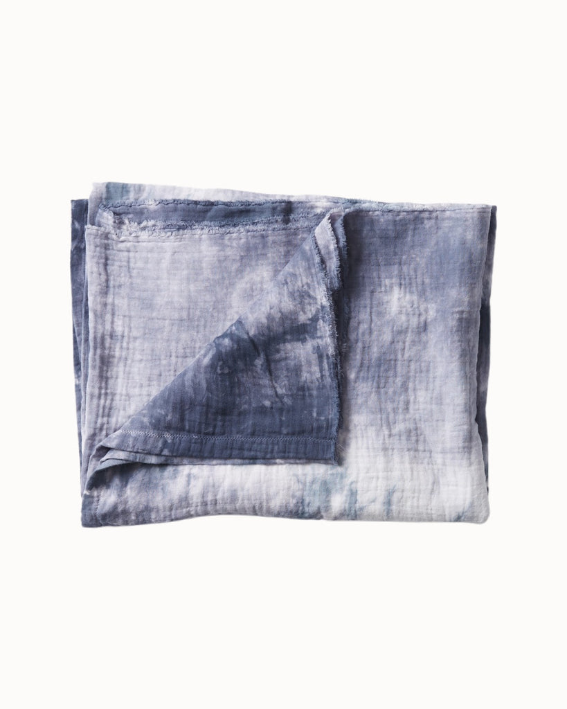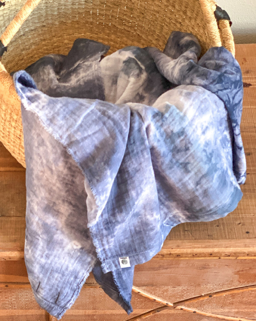 100% Cotton Triple Gauze throw blanket with distress dye.  Each blanket has been hand dyed and is completely unique.  Super soft and light, this blanket will look amazing styled in any room of your home. It is also great to take outside to the beach or on a picnic.