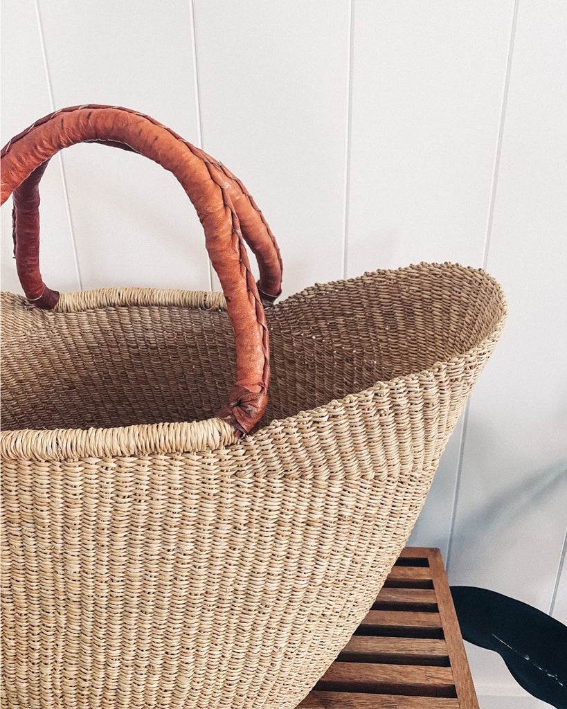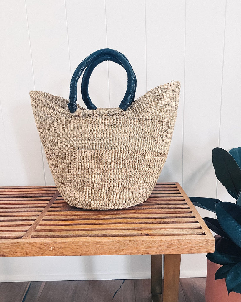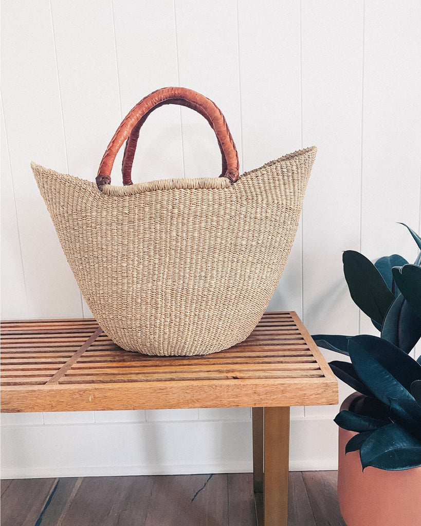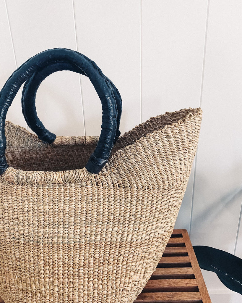 Market tote handwoven from artisans in Ghana. It is the perfect tote to take to the farmers market or to the beach. This tote features a leather wrapped handle.