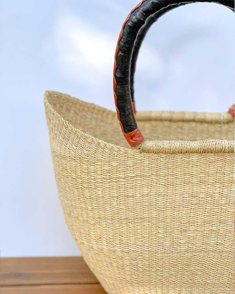 Market tote handwoven from artisans in Ghana. It is the perfect tote to take to the farmers market or to the beach. This tote features a leather wrapped handle.