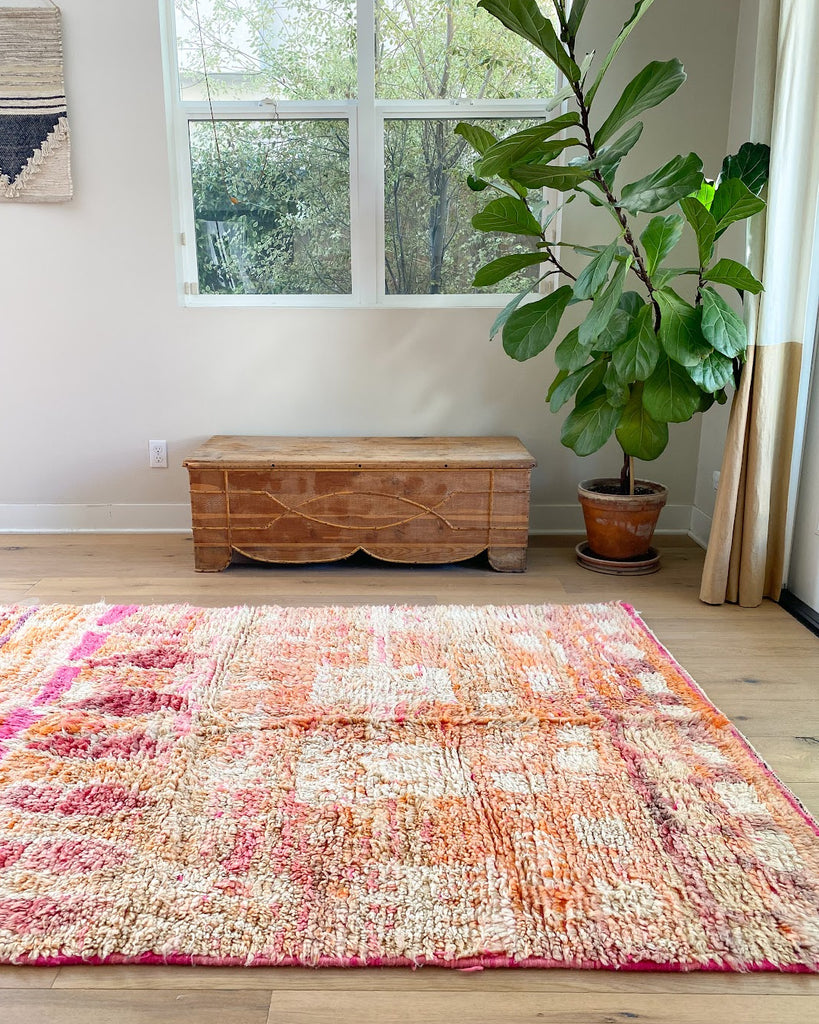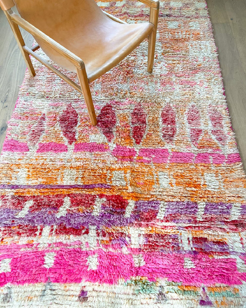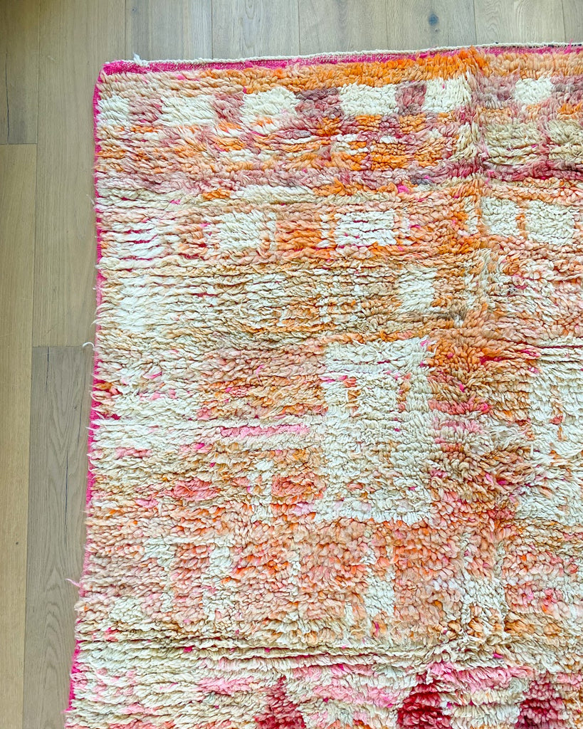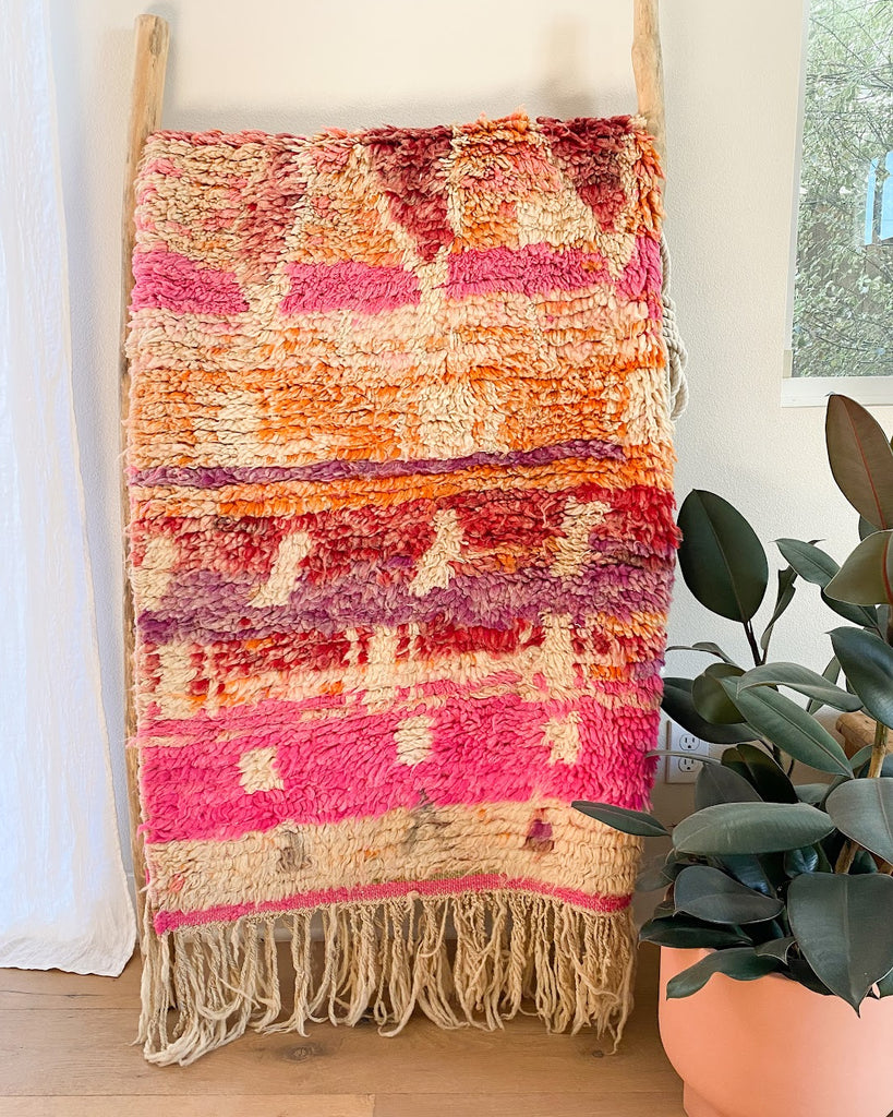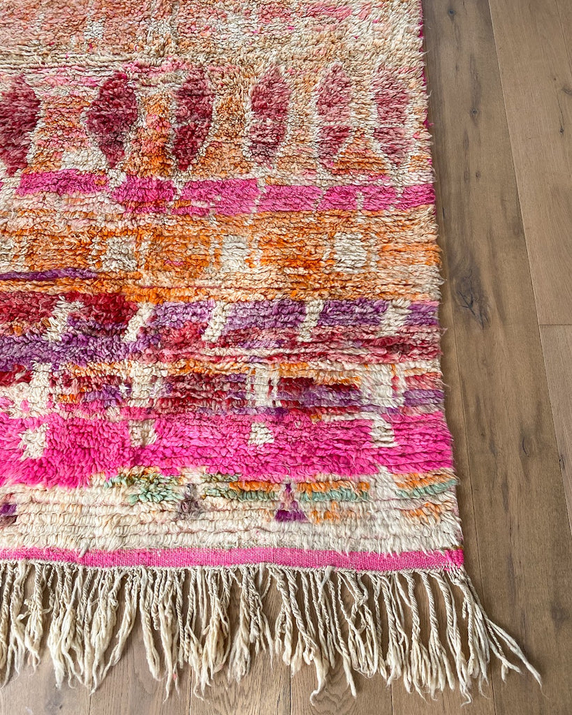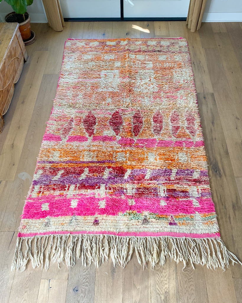 Vintage Moroccan Boujad Rug. Boujad rugs originate in the Atlas Mountains of Morocco. This rug is simply stunning and so unique. Multi color rug grounded in a natural wool color with pops of bright pink & orange, muted tones of blush and purple, and pops of faded rose. It features an ombre color fade and tribal design detail. High Pile. 100% Wool.