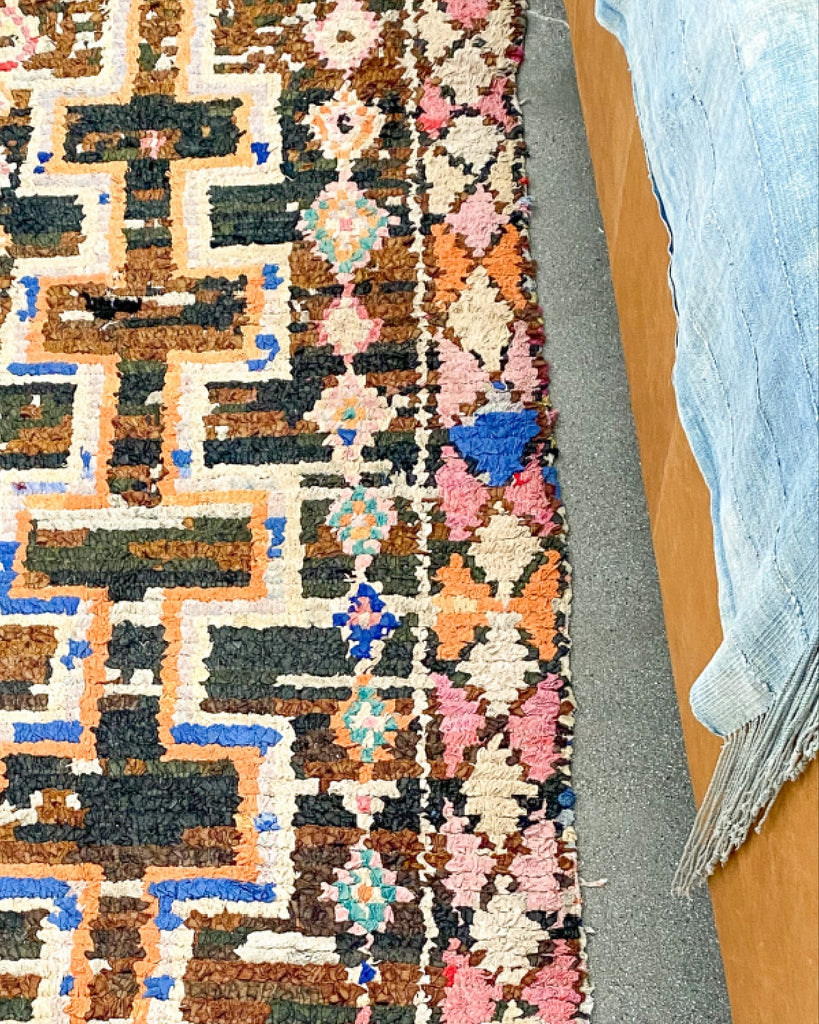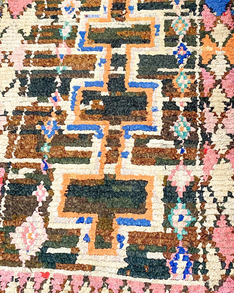 Vintage Moroccan Boucherouite runner. Boucherouite rugs are handmade using upcycled materials from old cotton rags and wool rugs. This runner has a cross design. Grounded in black with a multi color design.
