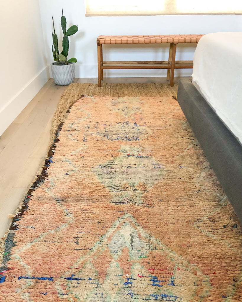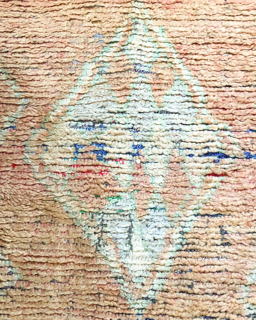 Vintage Moroccan Boujad runner. Boujad rugs originate in the Atlas Mountains of Morocco. Grounded in pink and blush tone with accents of blue, aqua, and neutral shades across a tribal design. As this rug is handmade, one side of this rug is slightly wider than the other. This Boujad runner would be great in an entry, hallway, or kitchen.