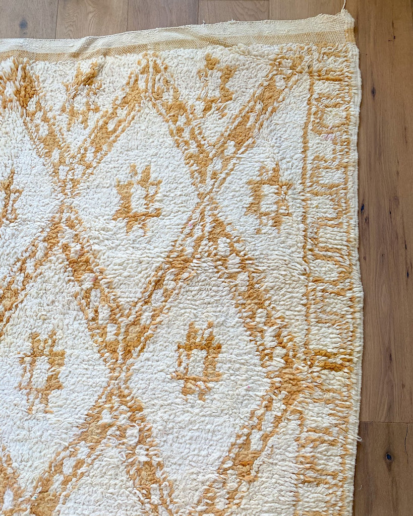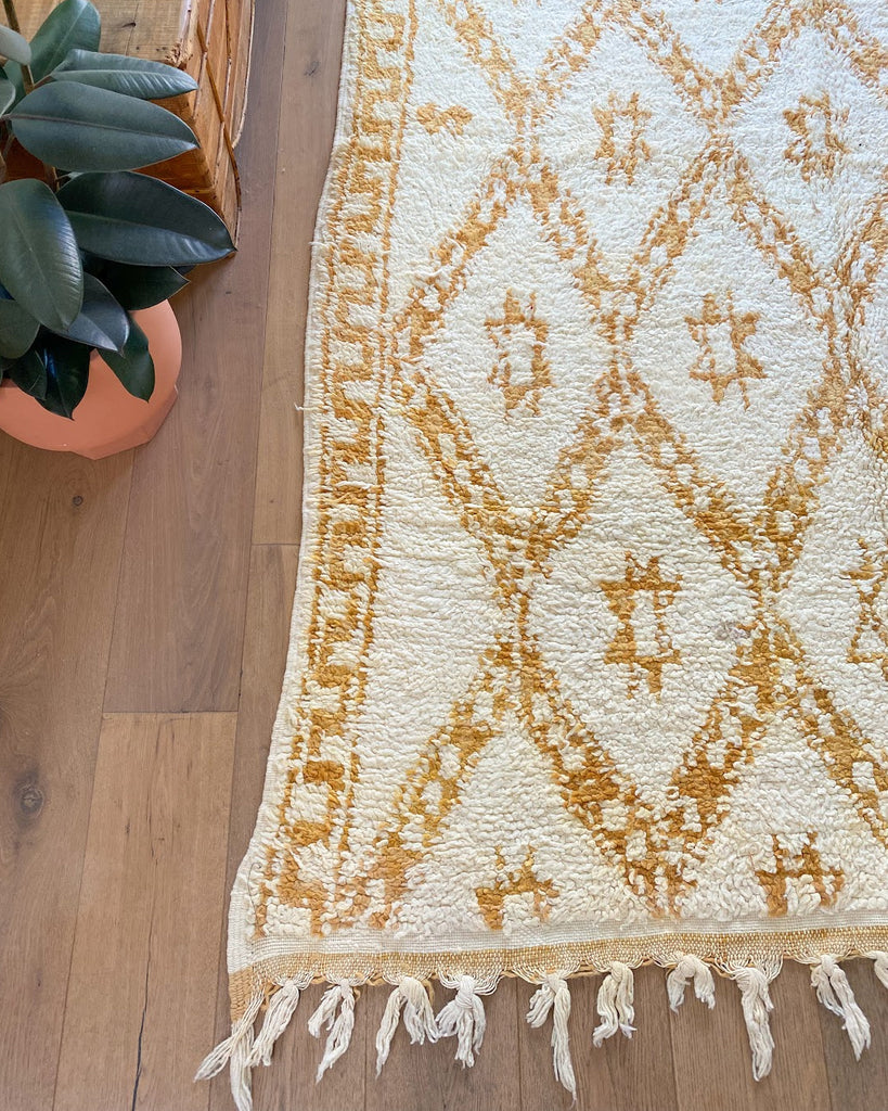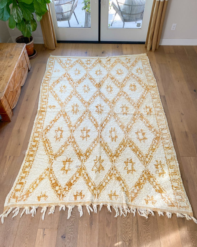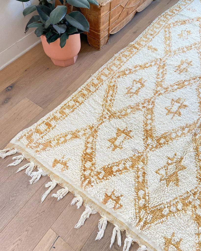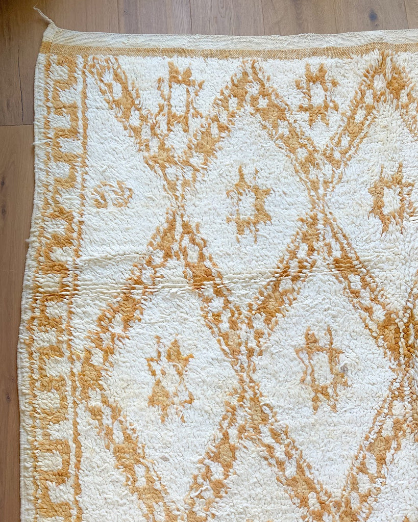 Vintage Moroccan Boujad Rug.  Boujad rugs originate in the Atlas Mountains of Morocco. Grounded in a Natural Cream color with muted Mustard accent color  It features a diamond and star pattern with border detail. Medium Pile.  100% Wool.