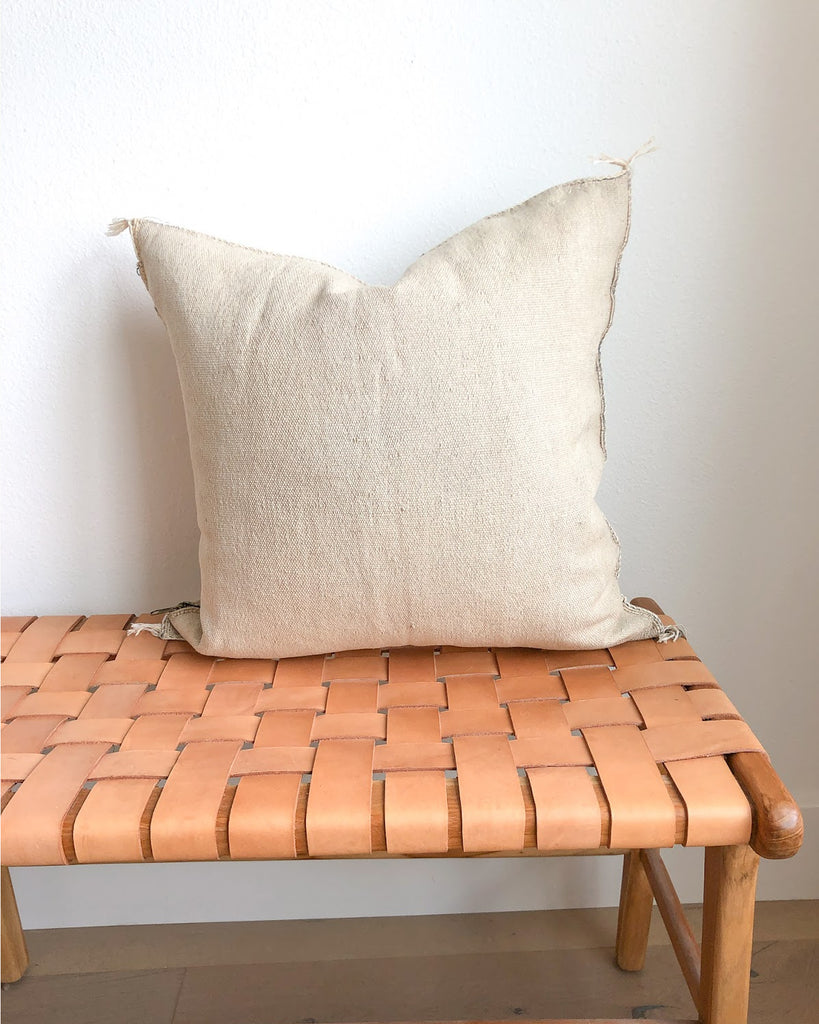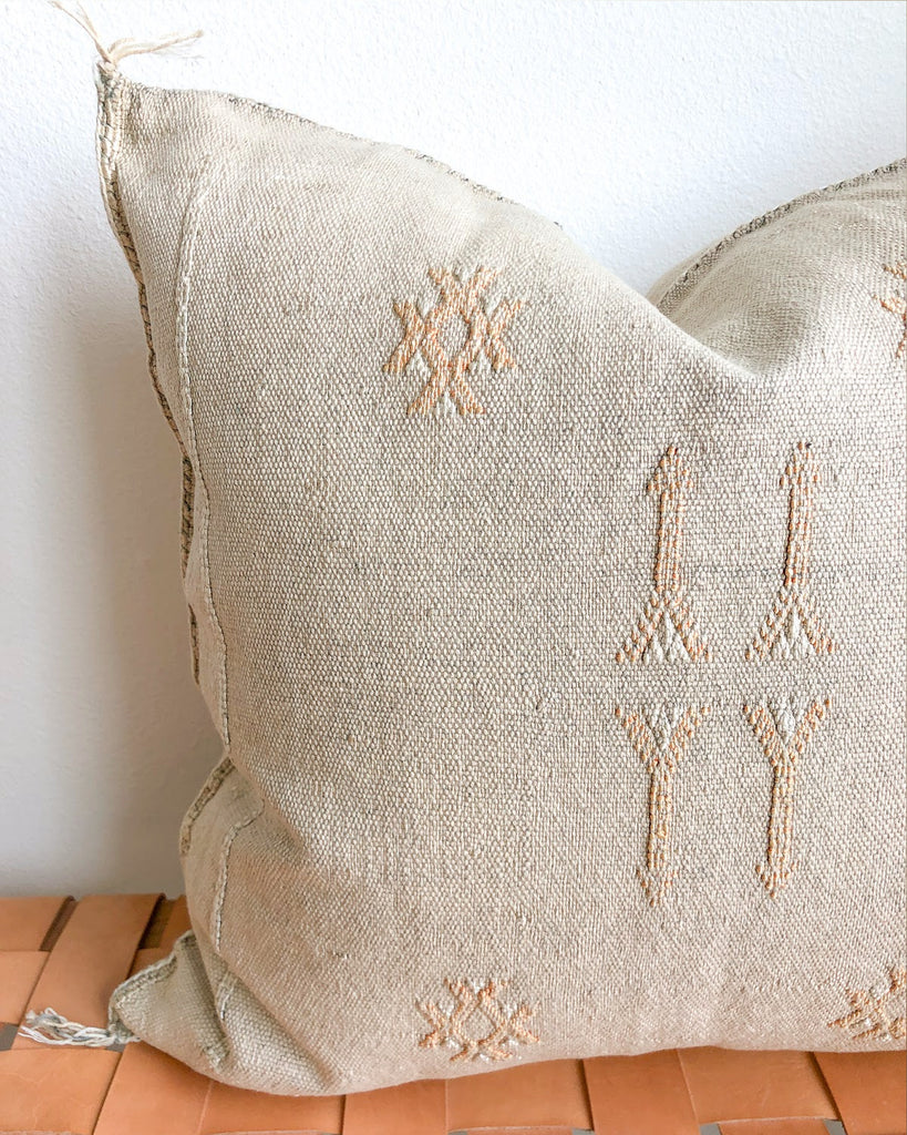Moroccan Sabra Silk pillow cover. These pillows are hand woven from fibers that are extracted from the Saharan agave cactus and wool. Hand stitched with decorative multi color design. Every pillow is completely unique. Zipper closure along bottom. Poly fill stuffed.